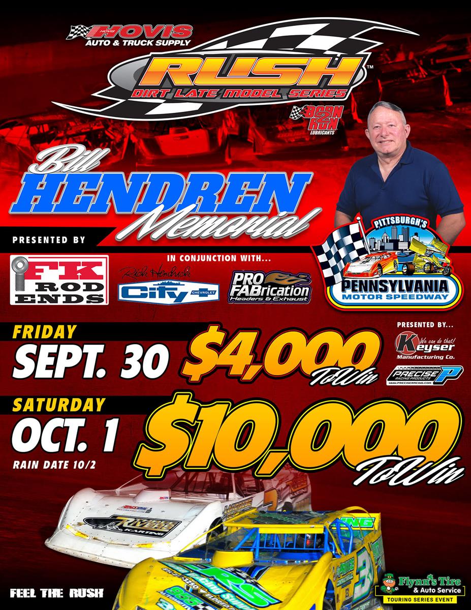 (Pulaski, PA)...The Hovis Auto & Truck Supply RUSH Dirt Late Model Series presented by Born2Run Lubricants is proud to announce a major purse increase for the annual "Bill Hendren Memorial" presented by FK Rod Ends in conjunction with City Chevrolet and Pro Fabrication. The two-night affair at Pittsburgh's PA Motor Speedway will offer a record payoff including a complete show on Friday night, September 30 paying $4,000 to-win presented by Keyser Manufacturing and Precise Racing Products followed up by a $10,000 to-win event on Saturday night, October 1! These two events will follow Tyler County Speedway on Thursday, September 29 for $4,000 to-win creating a three-night swing for the Flynn's Tire Touring Series with a possible $18,000 to-win!