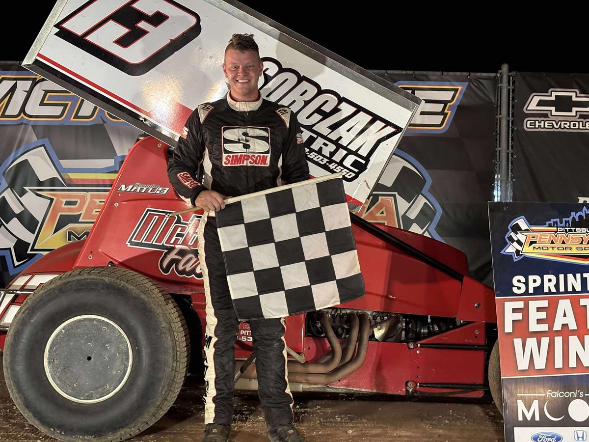 Brandon Matus (13) of Wampum was flawless, leading all 20 laps to capture the Falconi’s Moon Township Automotive 410 Sprint Car feature. Zach Gunn (17G) of McDonald stayed hot too, scoring his second win of the year in the Rohrich Automotive/Chevrolet Performance RUSH Late Models.